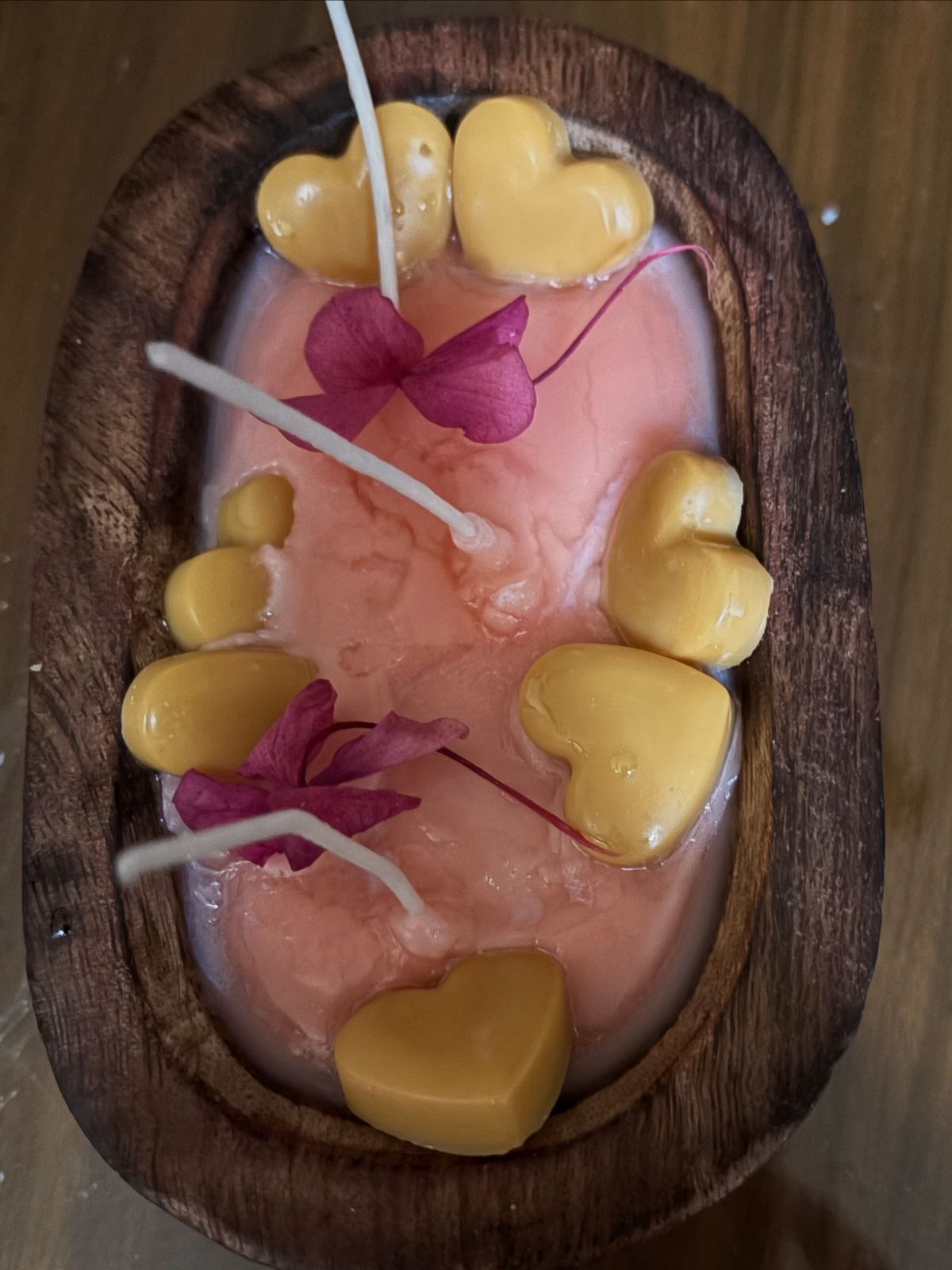 Boat Voyage is a handcrafted decorative candle set poured into a natural wooden bowl, inspired by warmth and gentle romance. Soft pink wax forms the base, accented with heart-shaped details and delicate floral touches, creating a cozy and artistic look. Designed for décor and gifting, this candle brings charm, calm, and elegance to any space.
